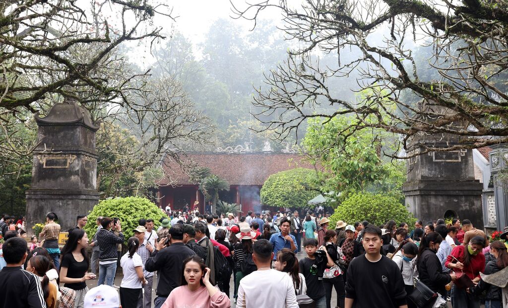 | Des visiteurs au site historique des temples dédiés aux rois fondateurs Hùng. |