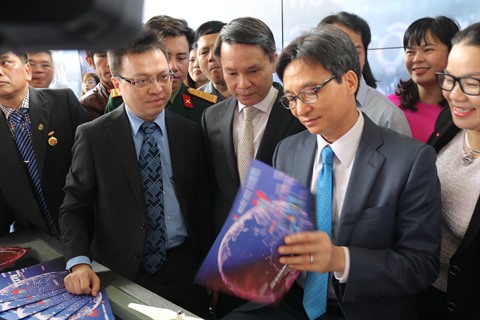 | Le vice-Premier ministre Vu Duc Dam (droite) au stand de l'Agence Vietnamienne d'Information. |