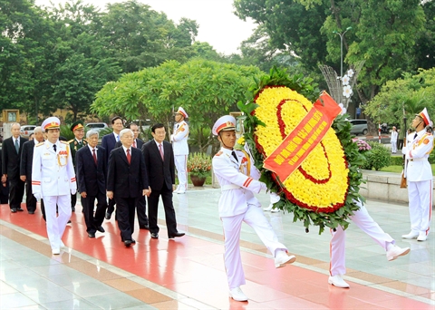 | Les dirigeants du Vietnam au Mémorial des Héros morts pour la Patrie, à Hanoi. |