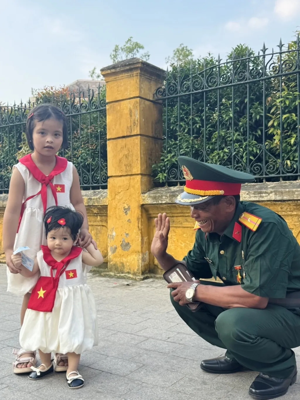 En arpentant une Hanoï parée de drapeaux et de décorations, entre immeubles modernes et trafic effervescent, il se sent un peu perdu. Mais une scène le bouleverse : deux enfants vêtus de t-shirts ornés du drapeau rouge à étoile jaune attirent son regard. Il s’arrête, les larmes aux yeux : "Je suis heureux de vous voir grandir dans la paix", leur murmure-t-il.