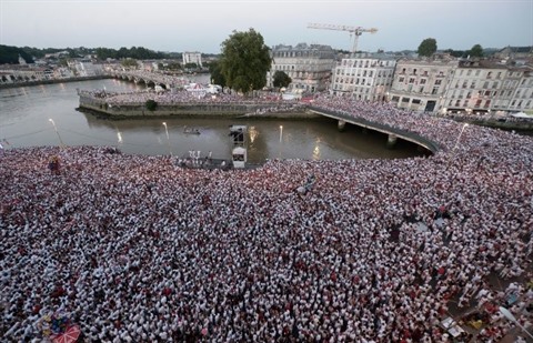 | Les festivaliers arrivent à Bayonne pour la cérémonie d'ouverture, le 25 juillet. |