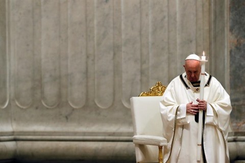 | Le pape François préside la veillée pascale, dans la basilique Saint-Pierre vide de fidèles, le 11 avril au Vatican |