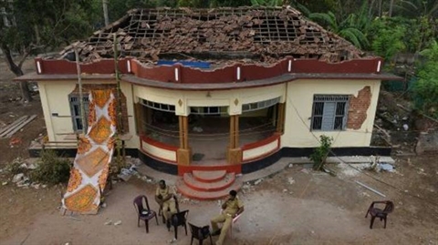 | Des policiers indiens sont assis, le 11 avril, devant le temple hindou de Puttingal, au lendemain de l'incendie déclenché par l'explosion d'un entrepôt des feux d'artifice. |