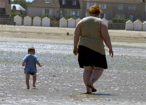 | Une femme souffrant d'obésité profite avec son enfant des plaisirs de la plage, le 9 juillet 2003 à Courseulles, dans le Calvados. |