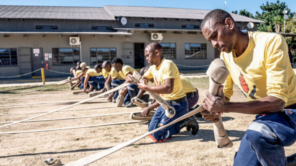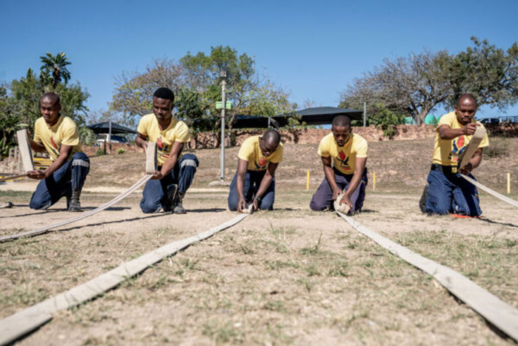 À la veille du départ, à Mbombela (Nord-Est), le groupe de pompiers sud-africains en uniforme bleu et jaune entonne un chant pour encourager deux collègues qui entament l'escalade d'un mur de combat. D'autres s'entraînent à enrouler rapidement la lance à incendie ou courent chargés de sacs de vingt kilos remplis d'équipement.