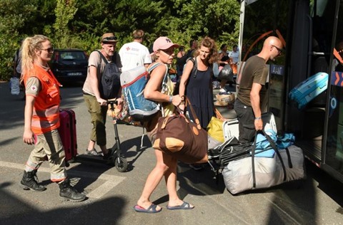 | Des touristes évacuent un camping près de La Teste-de-Buch (Gironde), le 15 juillet 2022. |