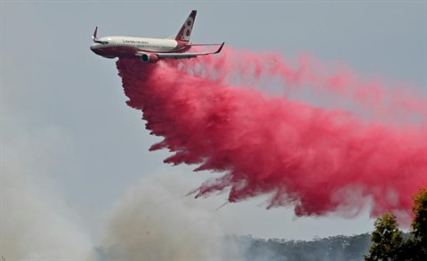 | Un avion déverse du retardateur de feu sur un incendie hors de contrôle près de Taree, à 350 km au nord de Sydney, le 12 novembre. |