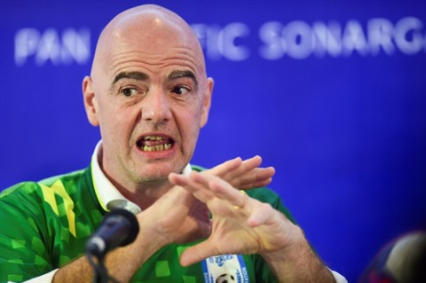 | Le président de la FIFA, Gianni Infantino, en conférence de presse à Dacca au Bangladesh, le 17 octobre. |
