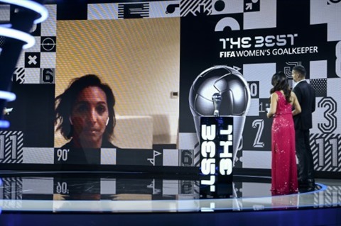 | La Lyonnaise apparaît à l'écran après avoir été désignée meilleure gardienne de la saison par la FIFA à Zurich, le 17 décembre. |
