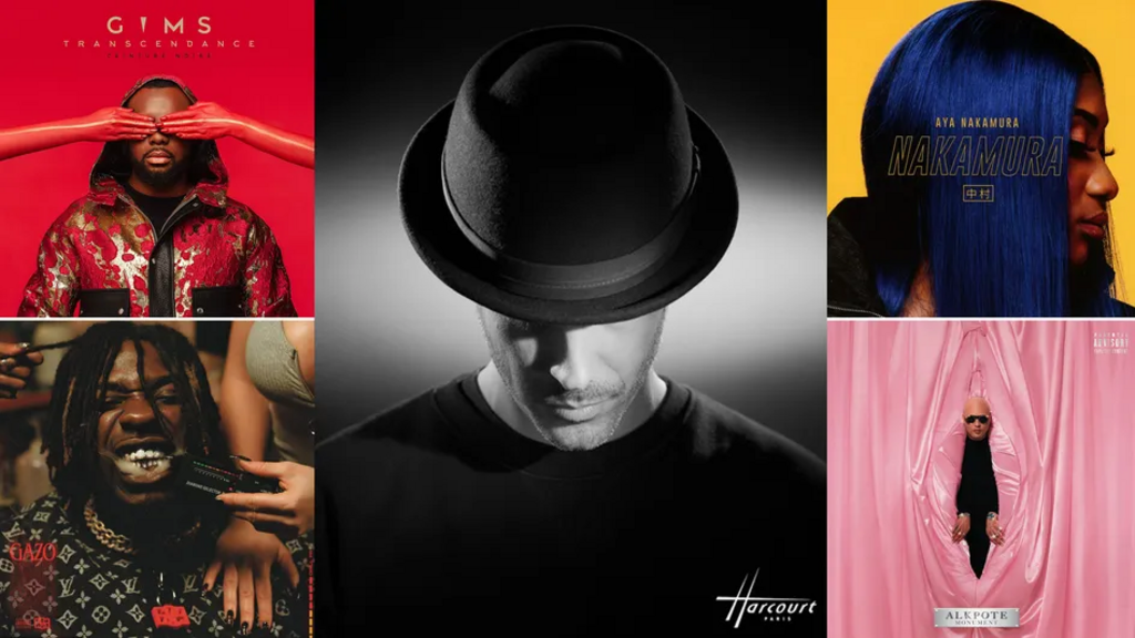 | Le portrait Harcourt du photographe Fifou, entouré de quelques unes des pochettes qu'il a réalisées, pour Maître Gims, Gazo, Aya Nakamura et Alkpote. |