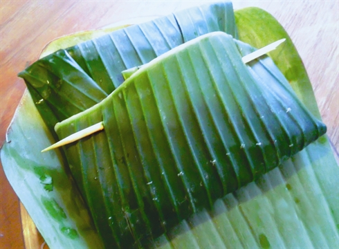 Repliez la feuille de bananier et refermez-la à l’aide d’une petite pique en bois.