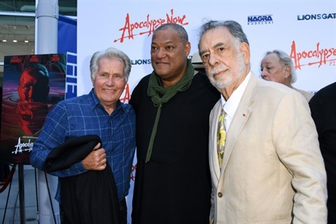 | Les acteurs Martin Sheen (gauche) et Laurence Fishburne posent le 12 août à Los Angeles avec le réalisateur Francis Ford Coppola avant la projection d'Apocalyse Now Final Cut. |