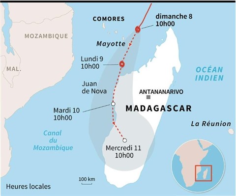 Selon Jean-François Colombet, interrogé en fin de journée par Mayotte La 1ère, les dernières observations de Météo-France montraient que le cyclone commençait à plonger vers le sud, et pourrait ainsi rester à une distance de 100 kilomètres de l'île. L'archipel voisin des Comores et l'île de Madagascar ont été de leur côté placés en alerte cyclonique respectivement orange et jaune, alors que le cyclone pourrait frapper les deux pays lundi, ont annoncé les autorités.