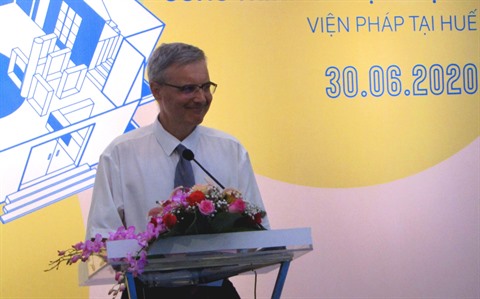 | L’ambassadeur de France au Vietnam, Nicolas Warnery, prend la parole à la tribune, le 30 juin à Huê, province de Thua Thiên-Huê (Centre). |