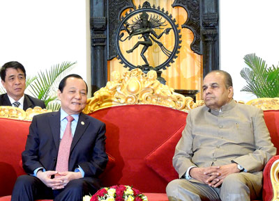 | Lê Thanh Hai, membre du Bureau politique et secrétaire du Comité municipal du Parti de Hô Chi Minh-Ville (gauche) et K. Sankaranarayanan, gouverneur de l'État de Maharashtra, lors d'une rencontre le 18 mars dans la ville de Mumbai. |