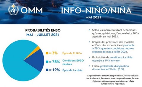 D'après le bulletin Info-Niño/Niña publié par l'Organisation météorologique mondiale (OMM), repris par des médias, la probabilité de conditions neutres - "c'est-à-dire ne s'apparentant ni à une anomalie El Niño ni à une anomalie La Niña" - dans le Pacifique tropical s'établit à 78% jusqu'à juillet, puis elle diminue et passe à 55% pour la période d'août à octobre. L'incertitude est plus grande pour le reste de l'année.