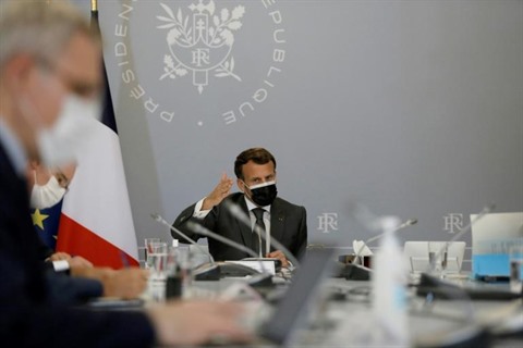 | Emmanuel Macron lors d'une réunion sur la campagne de vaccination à l'Élysée le 20 avril. |