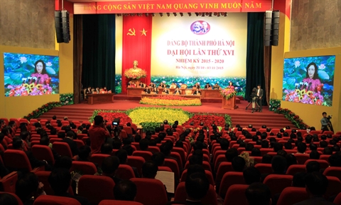 | Panorama de la cérémonie de clôture du XVIe Congrès de l'organisation du Parti pour Hanoi, le 3 novembre dans la capitale. |