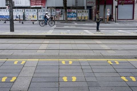 | Un quai de tramway avec des marques jaunes peintes sur le sol pour que les gens gardent les règles de distanciation sociale, le 8 mai à Nantes. |