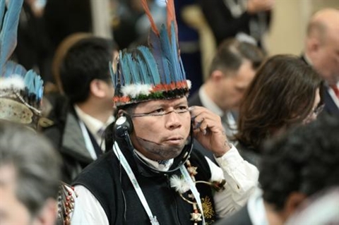 | Un Indien de la forêt amazonienne lors de la conférence sur le climat au Bourget près de Paris, le 4 décembre. |