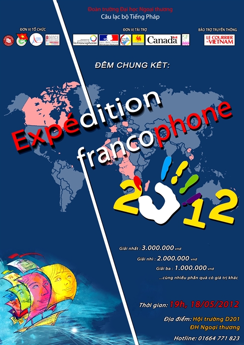 La finale de l’expédition francophone aura lieu le 18 mai à partir de 19h00 à l’École supérieure de commerce extérieur, sise 91, rue Chùa Lang, arrondissement de Dông Da, Hanoi (bâtiment D - salle D201). En 2012, la finale de l’expédition francophone sera organisée à grande échelle avec une nouvelle formule, laquelle devrait permettre aux jeunes passionné par la langue de Molière de démontrer et de perfectionner leurs connaissances linguistiques comme culturelles. Les équipes pourront se départager au meilleur des quatre manches au programme.