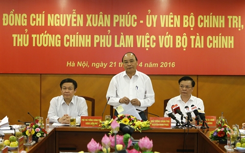 | Le Premier ministre Nguyên Xuân Phuc (debout), lors d'une séance de travail avec le ministère des Finances, le 21 avril à Hanoi. |