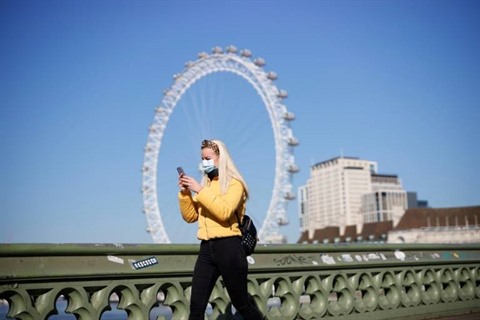 | Une passante portant un masque de protection, sur le pont de Westminster, le 25 mars 2020 à Londres. |