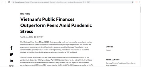 Dans un article publié sur son site, l’agence de notation Fitch Ratings prévoit que le ratio dette publique / PIB du Vietnam resterait à environ 39% en 2021 et 2022. Elle prévoit également une croissance du PIB vietnamien d'environ 7% en 2021 et 2022.