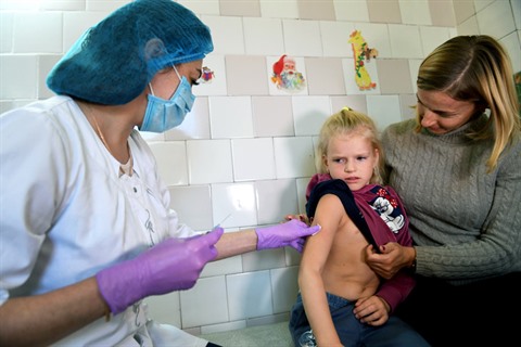 | Une infirmière vaccine une petite fille contre la rougeole, à Kiev, le 15 janvier |