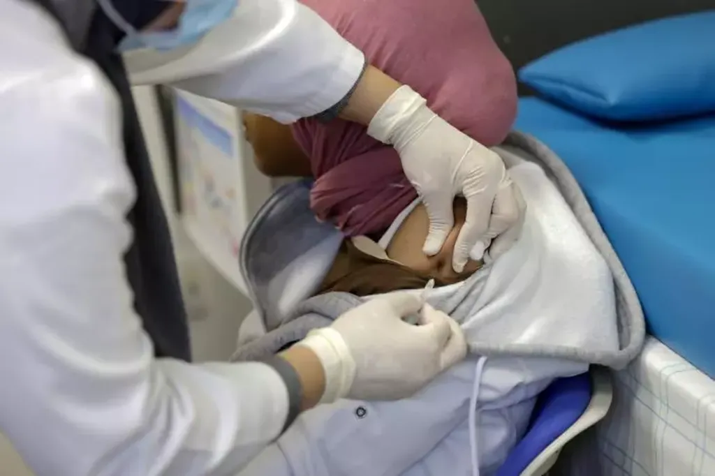 | Une soignante administre une dose de vaccin contre la rougeole dans un hôpital à Temara, le 27 février au Maroc. |