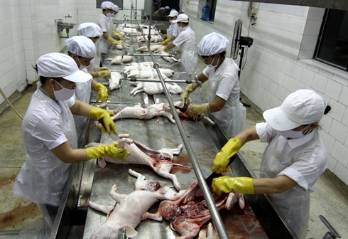 | Chaîne de traitement de viande de cochon d’une entreprise étrangère, dans la province de Nam Dinh (Nord). |