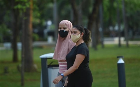 | Des jeunes Indonésiennes portent un masque à Jakarta. |