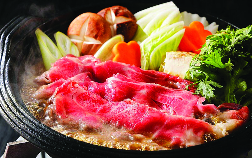 - Dans une marmite à fondue, disposer successivement l’oignon, le chou chinois, les chrysanthèmes, les champignons et le bœuf.