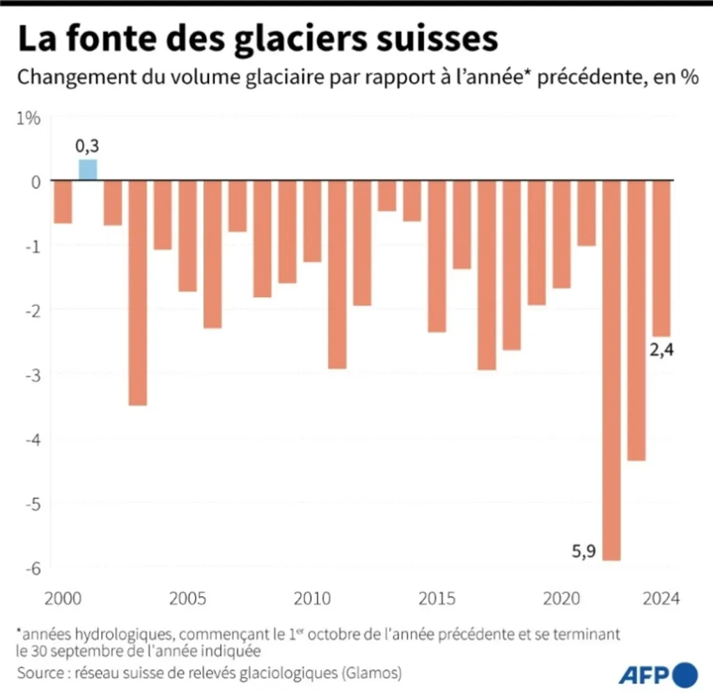 La fonte, très impactée par le changement climatique, est "un peu plus modérée" par rapport à 2022 et 2023, au cours desquelles un total d'environ 10% du volume glaciaire suisse a disparu, un record.
