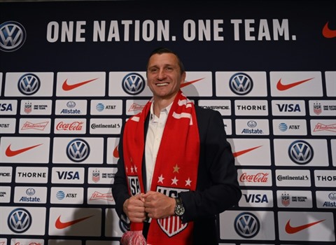 | Le nouveau sélectionneur de l'équipe féminine des États-Unis, Vlatko Andonovski, lors de sa présentation, le 28 octobre à New York. |