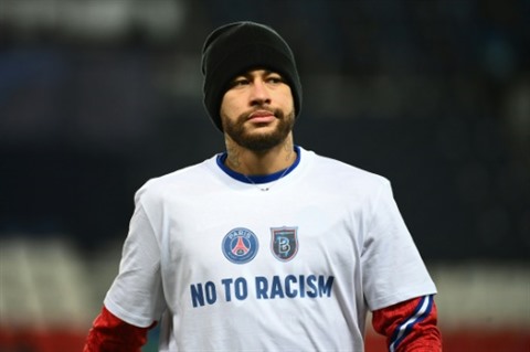 | L'attaquant brésilien du PSG, Neymar, porte un tee-shirt sur lequel est écrit "Non au racisme", au Parc des Princes, le 9 décembre. |