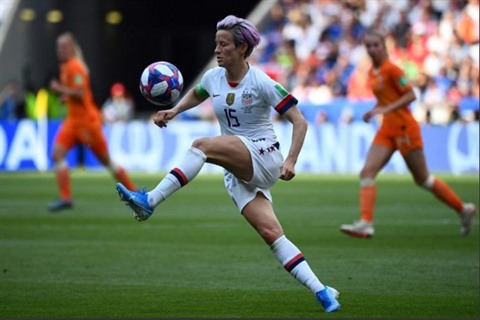 | Megan Rapinoe, l'une des figures emblématiques du football féminin, lors de la finale de la coupe du monde 2019 en France, le 7 juillet à Lyon. |