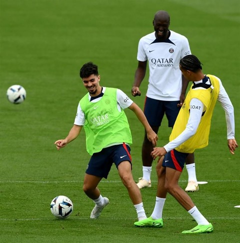 | Le milieu portugais Vitinha (en vert) et l'attaquant français du Paris SG Hugo Ekitike (en jaune) à l'entrainement le 26 août à Saint-Germain-en-Laye. |