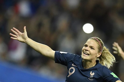 | Eugénie Le Sommer célèbre un but en juin 2019 à Nice. |