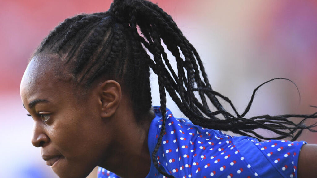 | Marie-Antoinette Katoto à l'échauffement avec les Bleues avant d'affronter la Belgique lors du dernier Euro à Rotherham, le 14 juillet 2022. |