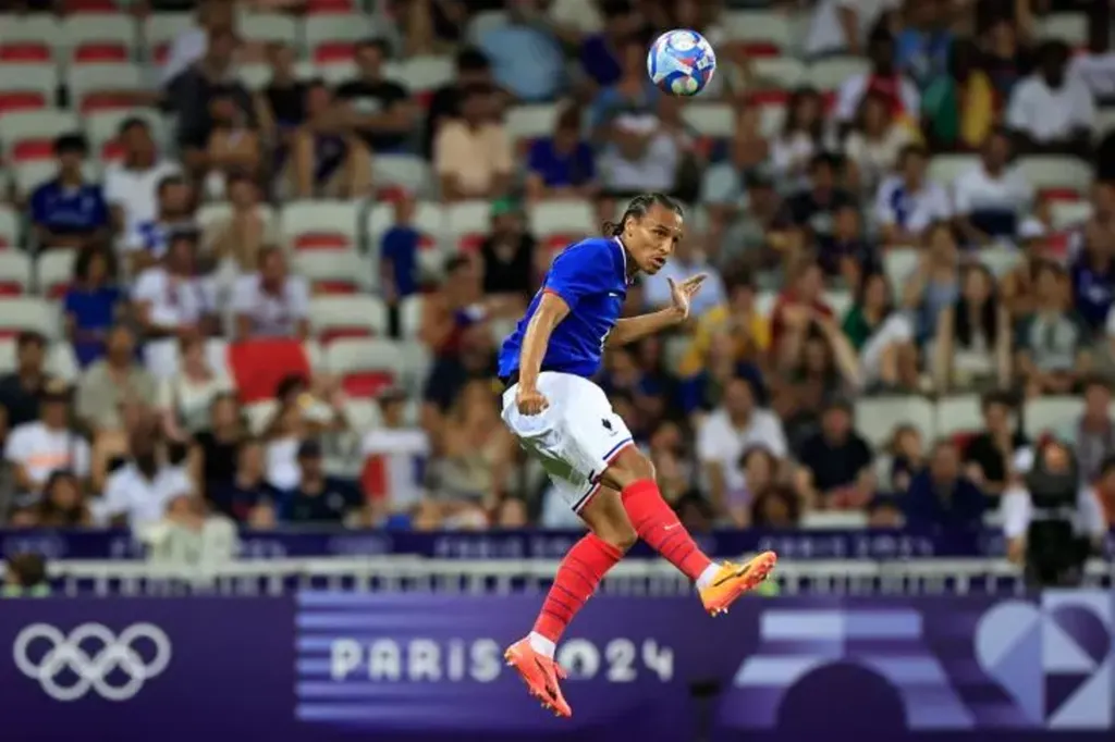 | Le défenseur français Kiliann Sildillia contre la Guinée, le 27 juillet à Nice. |