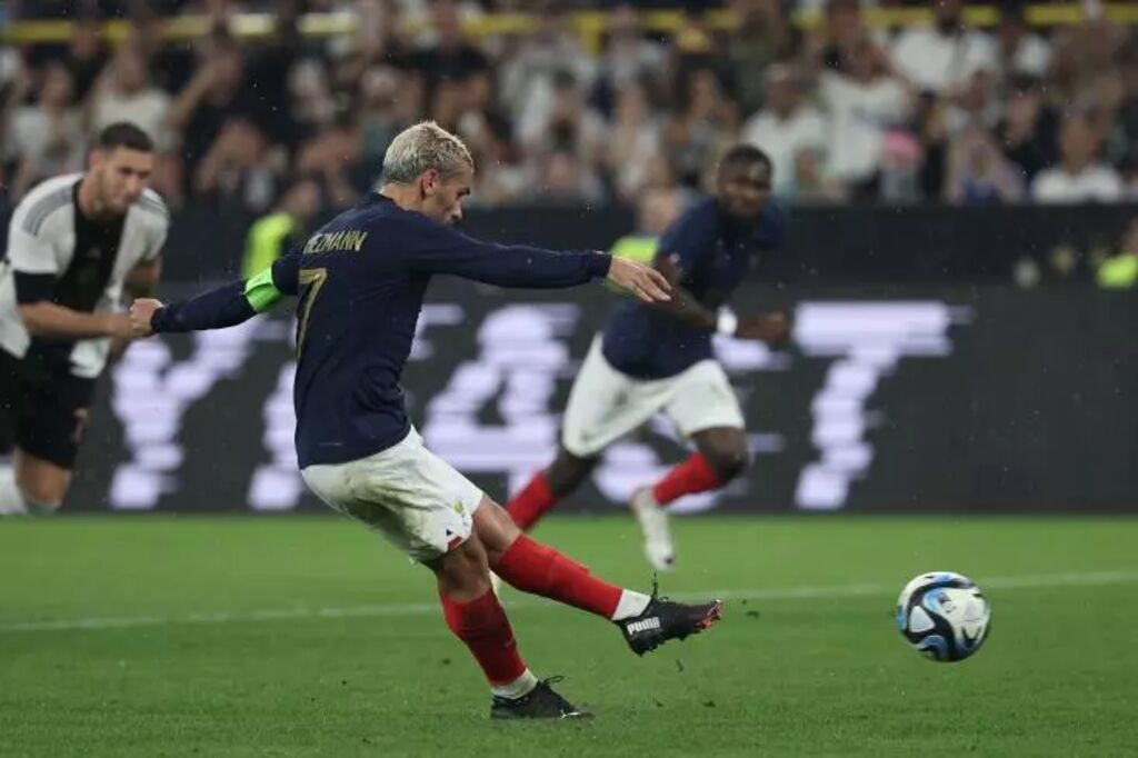 | Antoine Griezmann réduit la marque pour la France sur penalty contre l'Allemagne le 12 septembre à Dortmund. |