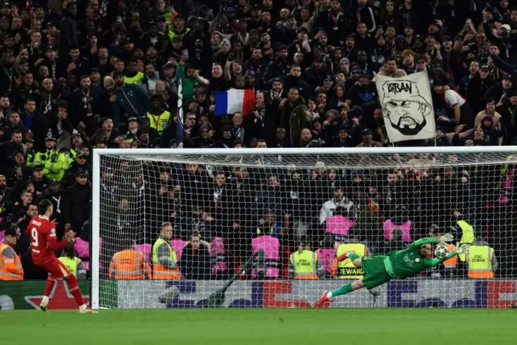 | Le gardien du PSG Gianluigi Donnarumma détourne le penalty de Darwin Nunez, de Liverpool, en quart de finale retour de la Ligue des cahmpions le 11 mars au stade d'Anfield Road à Liverpool. |