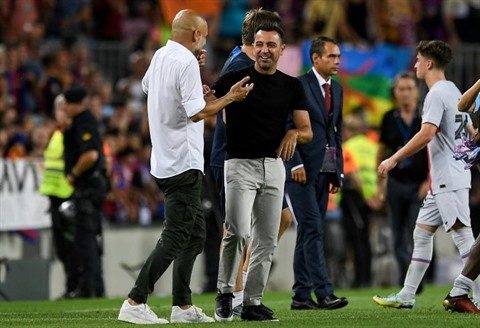 | Les entraîneurs de Manchester City, Pep Guardiola (gauche), et de Barcelone, Xavi, à l'issue d'un match de charité au Camp Nou, le 24 août. |