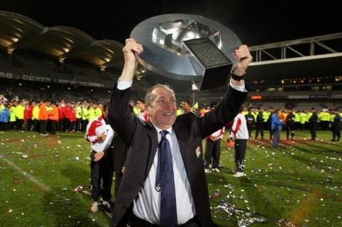 | Gérard Houllier brandit le trophée de champion de France remporté avec Lyon le 27 mai 2007 au stade Gerland de Lyon. |