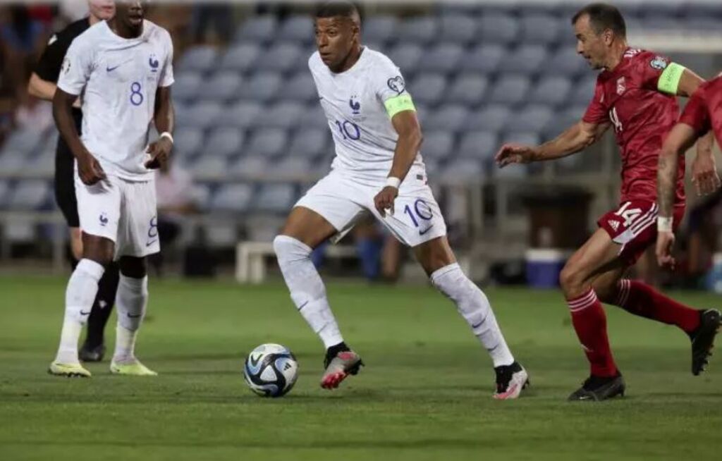 | Le capitaine des Bleus, Kylian Mbappé, contre Gibraltar, le 16 juin à Faro. |