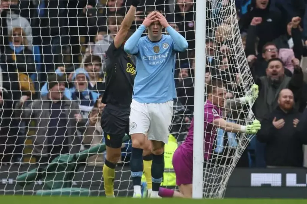 | L'attaquant de Manchester City Erling Haaland se prend la tête à deux mains après avoir raté un penalty contre Everton en Premier League le 26 décembre à l'Etihad Stadium de Manchester en Angleterre. |