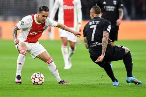 | L'attaquant brésilien Antony (gauche) lors du match de la Ligue des champions entre l'Ajax et le Benfica Lisbonne, le 15 mars 2022 à Amsterdam. |