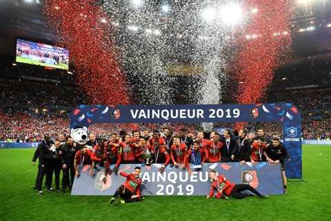| Les joueurs de Rennes, victorieux de la Coupe de France, le 27 avril 2019 au Stade de France. |