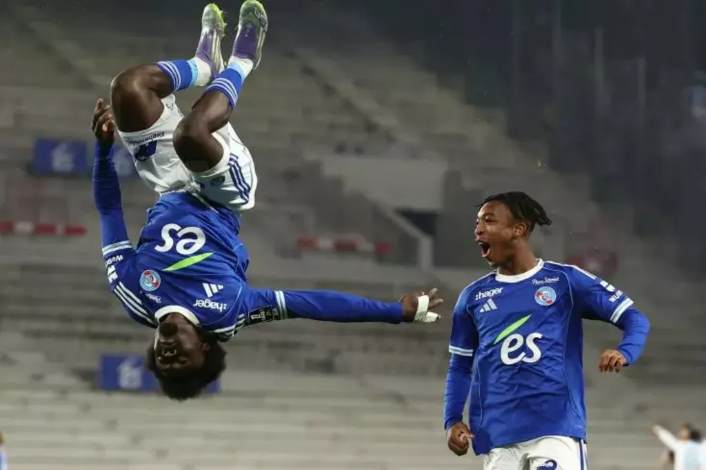 | Abdoul Ouattara (saut périlleux) auteur de l'ouverture du score contre Marseille après un bon service d'Emanuel Emegha (invisible), le 26 septembre 2025 à Strasbourg. |